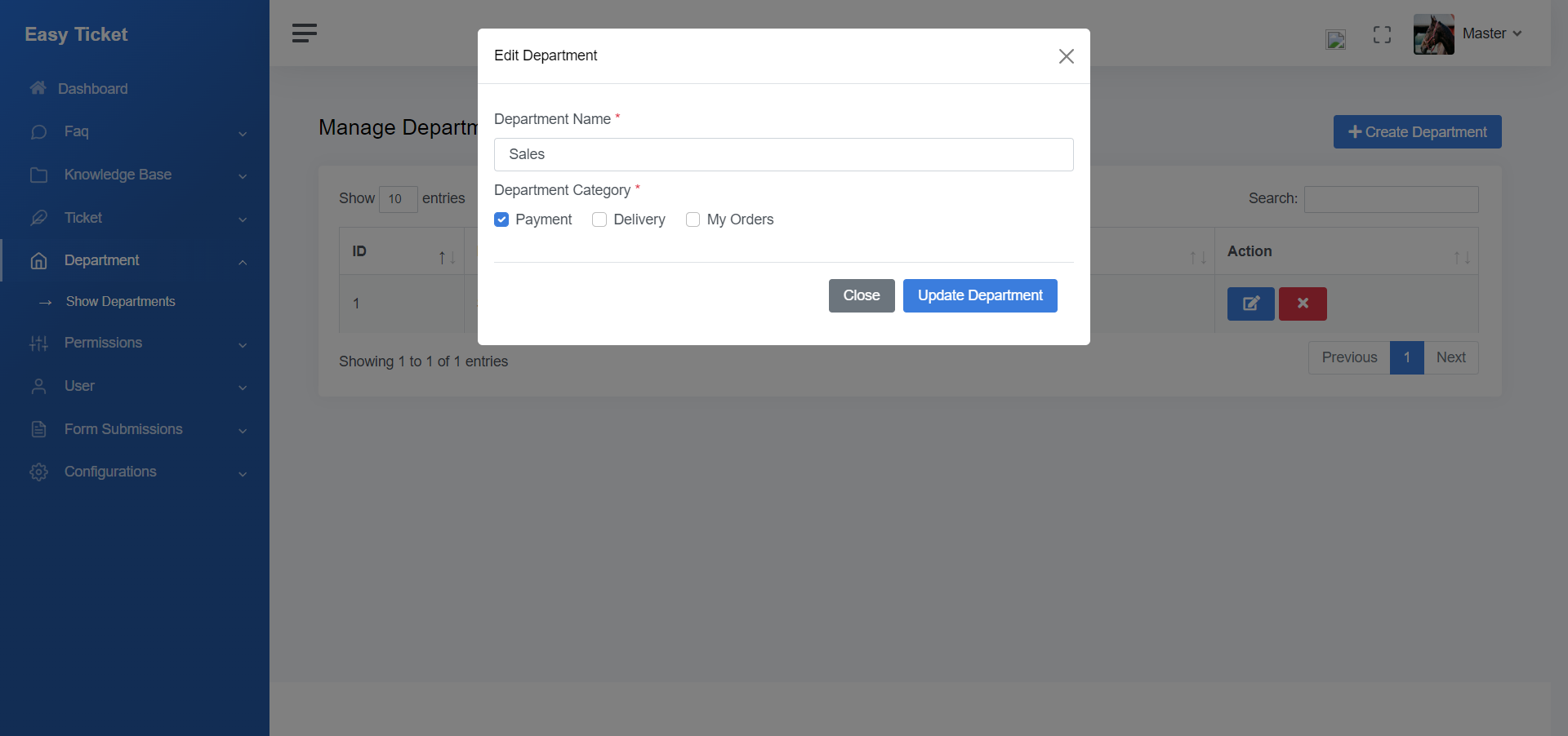 To edit the department click on the edit icon from your department listing, then you can see the UI like the below one, just click on the update to edit your department.
