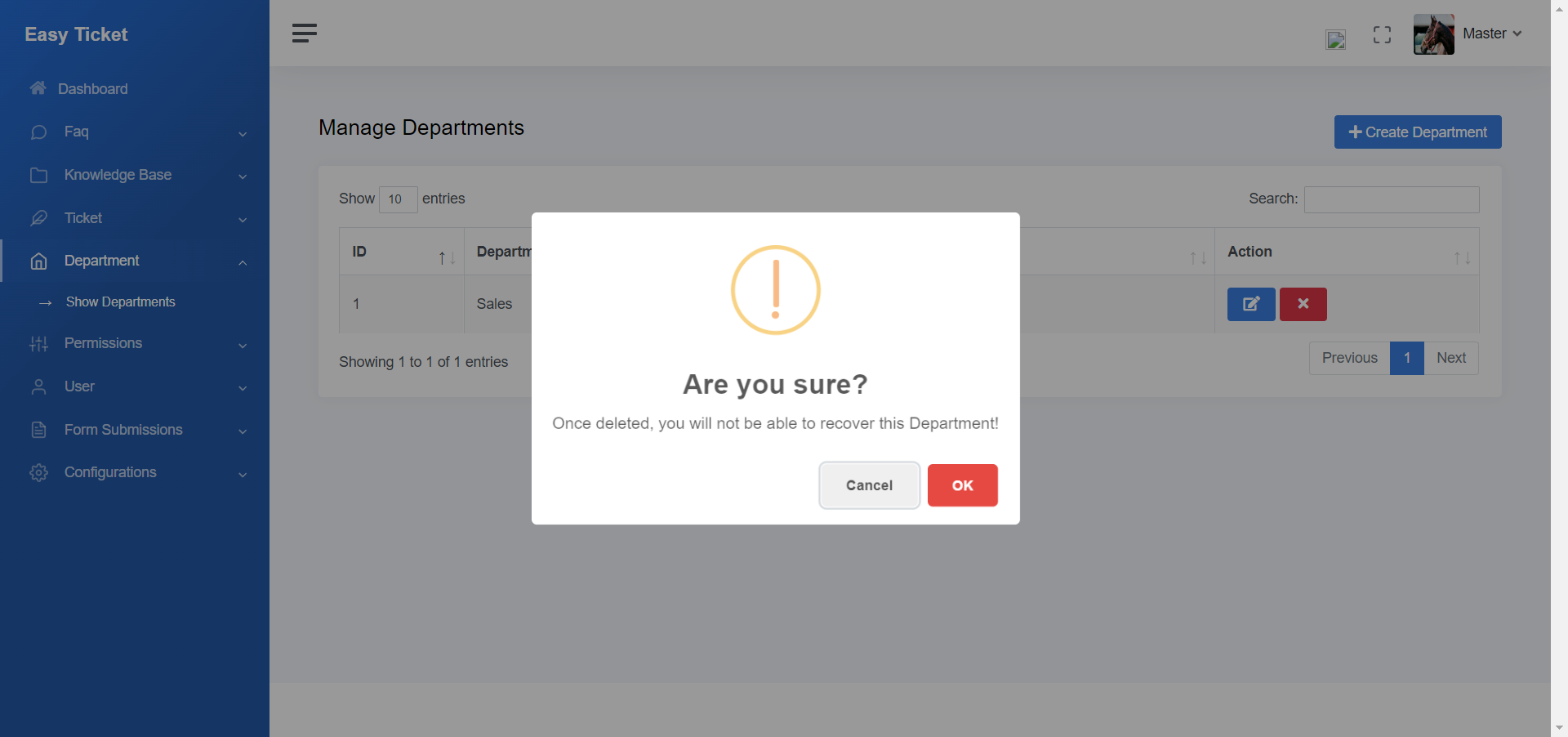 To delete the department click on the cross button from the department listing, we will ask before deleting any item.