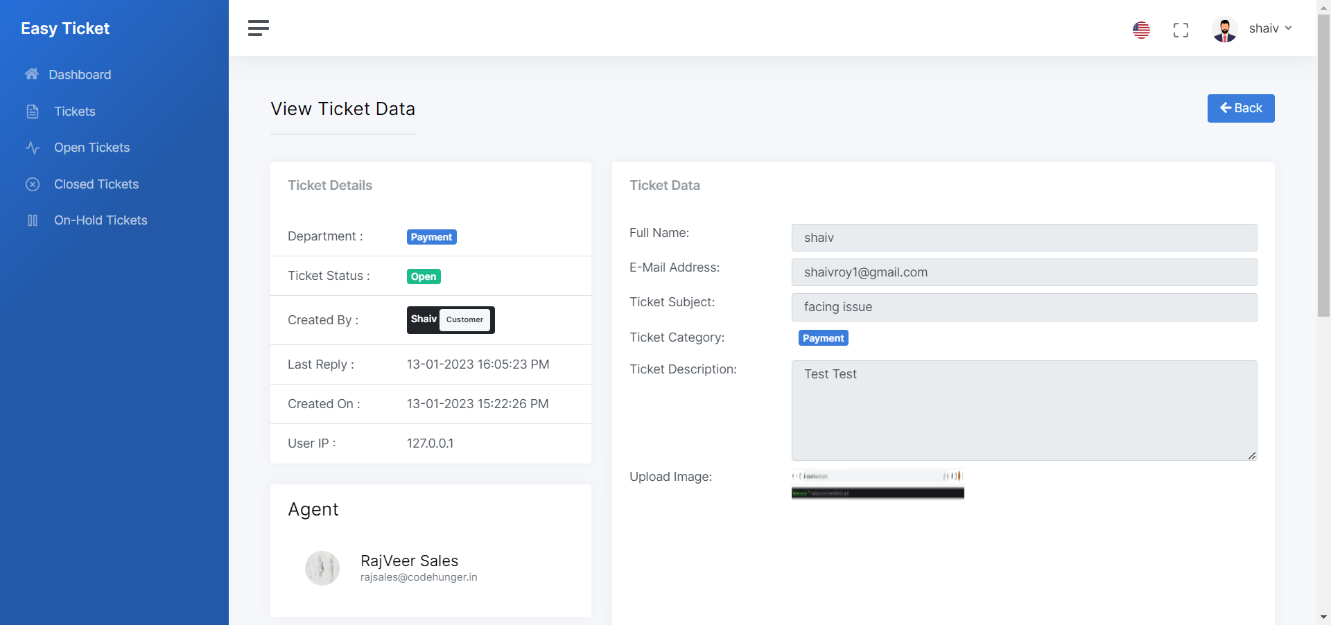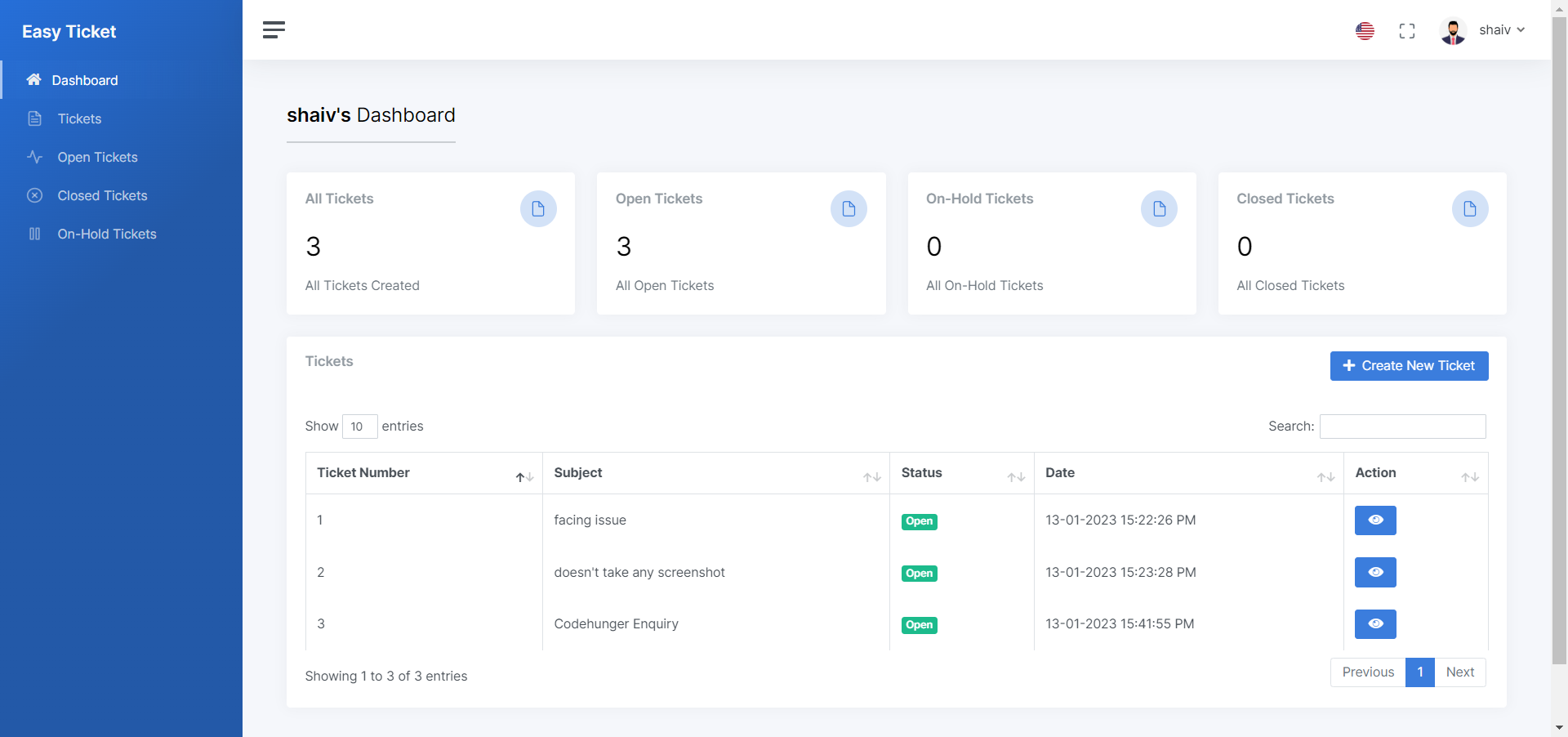 After Login, you will diretly land to the dashboard page, where we are showing all tickets, open tickets, on-hold tickets and closed tickets.