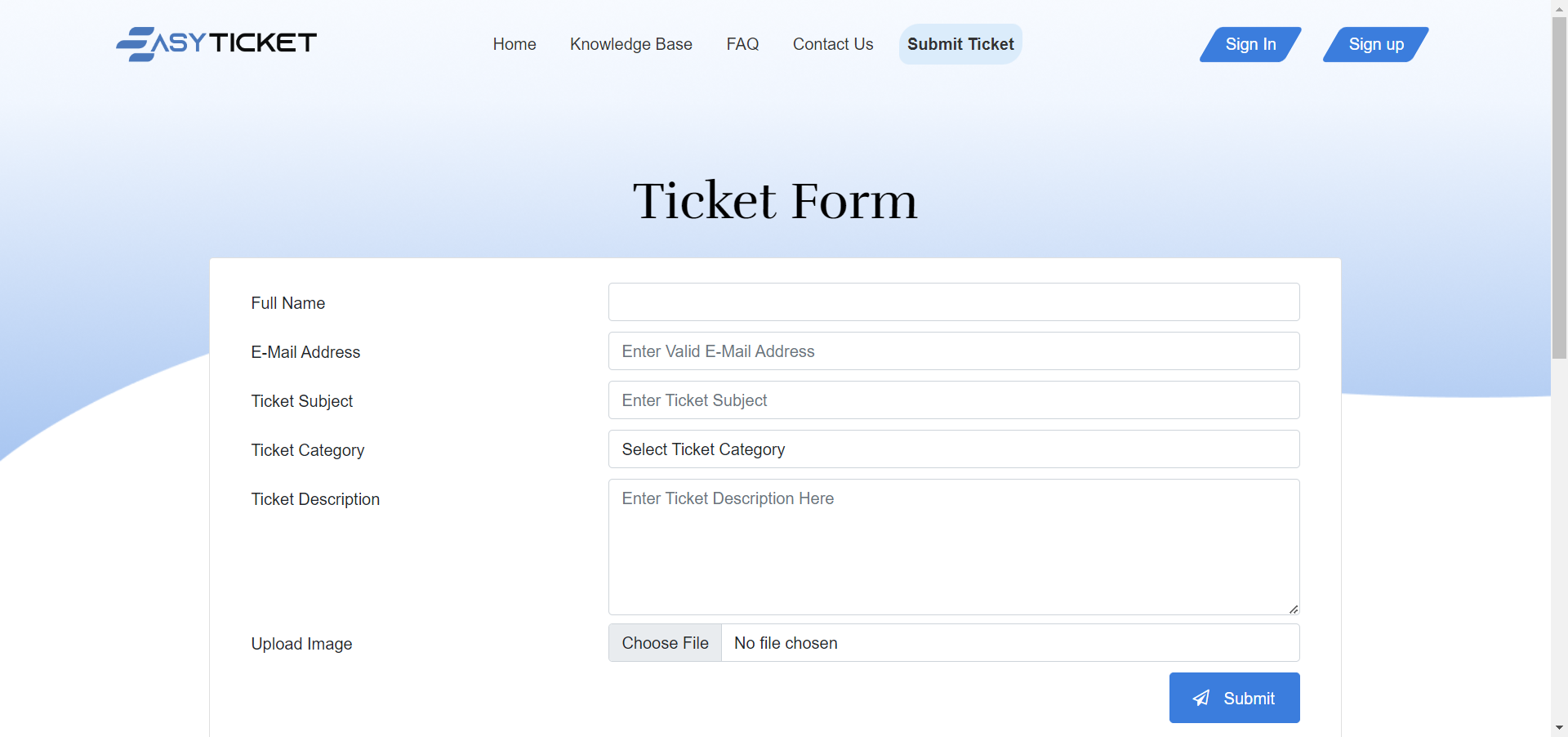 Our Submit ticket page has a dynamic form field, which means the form field is on your fingertip, you can add or remove the form field as per your choice, to know more about how to manage ticket form field, please refer to this link <https://code-hunger.gitbook.io/easy-ticket/administrator-login/ticket/dynamic-form-field>
